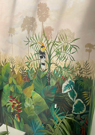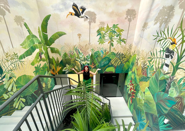 This mural was created to completely transform a blindingly white and sunlit staircase where it was impossible to bring in real plants. Spanning over 60 square meters and painted with more than 100 hours of work, the piece celebrates the vibrant flora and fauna of Cambodia.