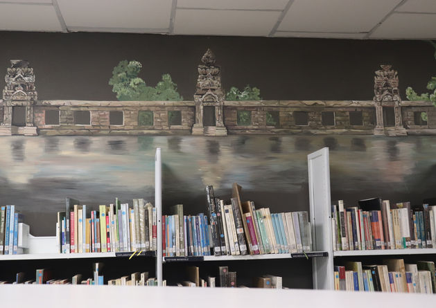 The mural is located within the Cambodia Collection area of the library, creating a visual link between the artwork and the books. It invites visitors to explore the collection and deepen their understanding of Cambodian history, heritage, and culture.
