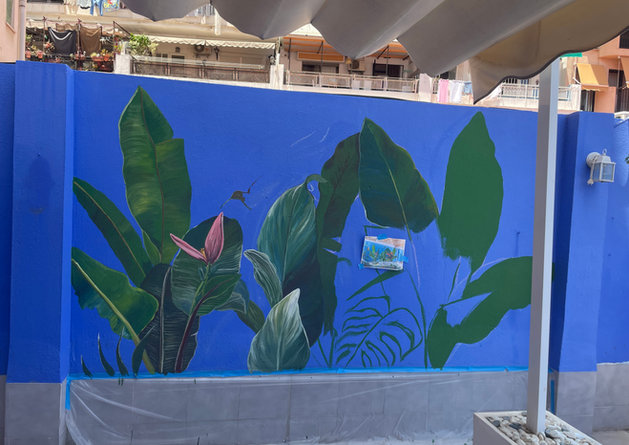 This mural was designed to bring the vibrant spirit of Jamaica to a terrace in Spain, creating a space that feels like home for my client who once lived there. The lush tropical foliage—banana leaves, heliconia, and bird of paradise—evokes the richness of Caribbean landscapes, while Jamaican hummingbirds hover among the blossoms, adding movement and life to the scene.